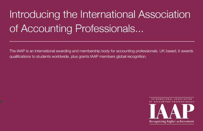 英国国际专业会计师公会InternationalAssociationOfAccountingProfessionals简称IAAP,总部位于英国伦敦肯特区丘吉尔广场,成立于1973年,是IAB(Internationalassociationofbookkeepers)英国国际簿记师公会的高级执业鉴定职能部门,代表I